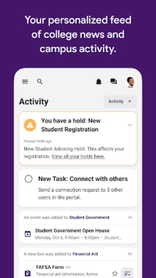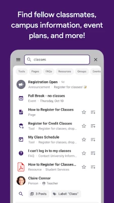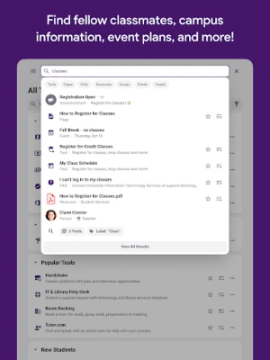 - Receive key notifications - Keep updated on announcements and alerts relevant to you - Search staff, peers, systems, groups, posts, resources and more - Connect with departments, services, organizations and peers - Stay focused on your most important to-dos - View personalized resources and content - Find and join campus events